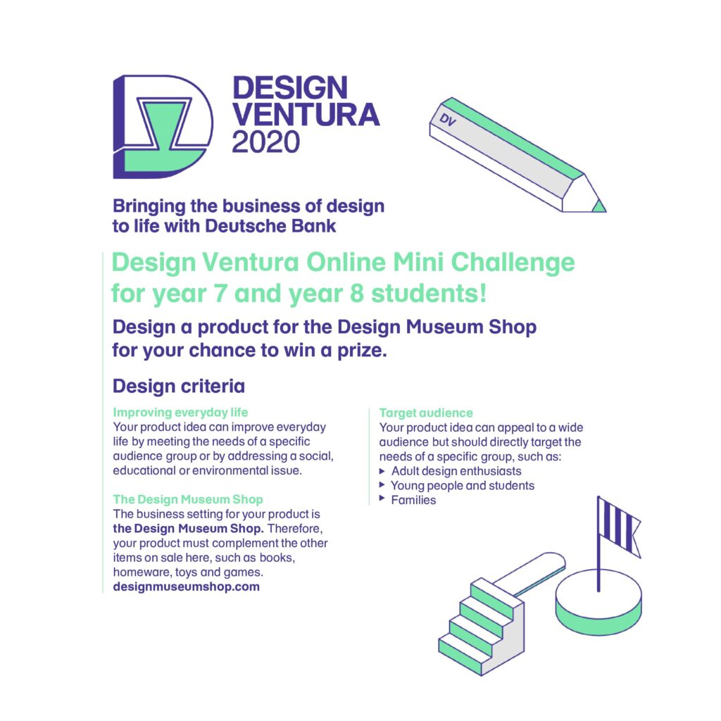Please note that you will need consent form a parent or guardian to enter the Design Ventura online mini challenge, see Data Protection Policy and Privacy Notice. If your school requires a parental consent form for this, please feel free to use the version provided here.